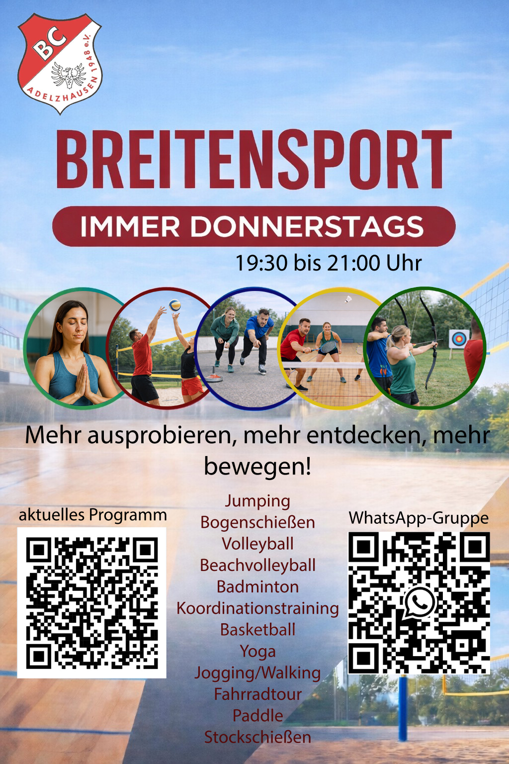 Freue dich ab dem 15. Januar 2026 auf spannende Sportarten, die du schon immer ausprobieren wolltest: Ob actionreiches Volleyball, schnelles Badminton, trendiges Padel oder entspannendes Yoga – hier findest du die perfekte Mischung aus Dynamik, Ausgleich und Gemeinschaft! Ganz egal, ob Einsteiger oder Sportbegeisterter: Beim Breitensport steht die Freude an der Bewegung im Mittelpunkt.